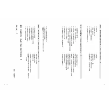 血液檢查揭示的資訊/什麼是「血液生物標記」?/安潔莉娜・裘莉與 BRCA 基因突變/癌症從哪來?/非侵入式疾病預測,有可能嗎?/期待中的行為生物標記/健康監測科技的下一步/從呼氣檢測疾病/大腦結構能預測智力嗎?/尋找心理狀態的生物標記/探討憂鬱症與營養補充品的科學根據/憂鬱症的「單胺假說」/抗憂鬱藥物與作用機制/憂鬱症藥物的現況與更多可能/抗憂鬱藥的效果與隱藏的副作用/如何判定憂鬱症?/如何有效避免憂鬱症?/新一代抗憂鬱藥物的可能性/憂鬱症治療為何這麼難?/專欄 迷幻藥治憂鬱?解密新興療法的科學潛力