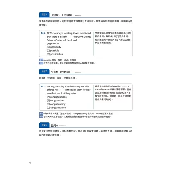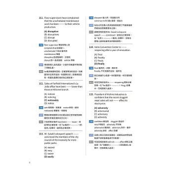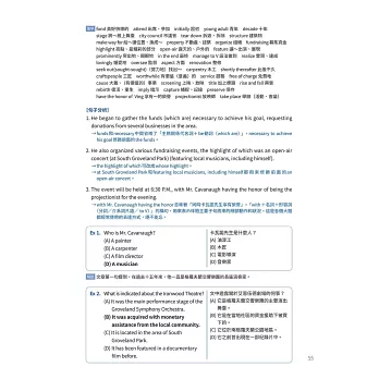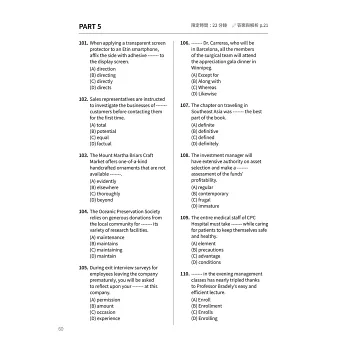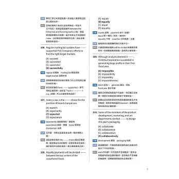 此外,本書的練習設計極為扎實:除針對各題型的大量實戰演練題,還特別收錄仿真模擬測驗(Actual Test),讓考生可在模擬真實考試時間與壓力的情境下,進行全方位檢測。這不僅能幫助考生檢驗學習成果,更能在正式考試時維持穩定的節奏與心態,減少失常發揮的可能性。