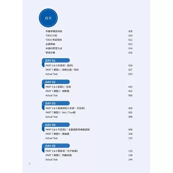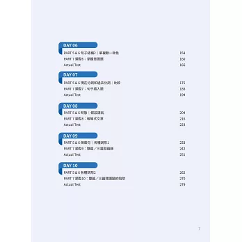 我尤其欣賞本書的「日課模組」:每日固定順序──Part 5/6 文法說明與例題、文法練習、Part 7 閱讀理解說明與例題、Today’s Vocabulary、Actual Test。一頁頁學,一題題練,從輸入到輸出閉環完成,學習動線清澈、不走冤枉路。