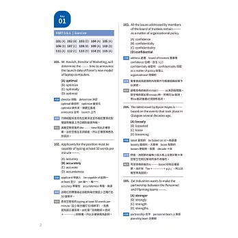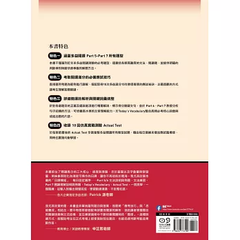 本書囊括多益測驗出過的所有文法問題類型,可以說沒有出現在本書中的類型便不會出現於測驗中。此外,本書針對所有問題類型提供最準確、最快速的解題策略,也為想取得高分的讀者收錄了大量高難度的詞彙問題,並在Part 7涵蓋許多複雜的長句、高級詞彙及高難度題目,以期完善讀者的閱讀理解能力。