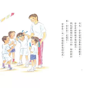 安安在接力賽中跌倒了,班上因此沒能得第一,他一直很自責,擔心同學會怪他。原來,安安比賽當天發燒、要長水痘了,他因此鬆了一口氣,很高興可以在家靜養幾天,不必面對同學。