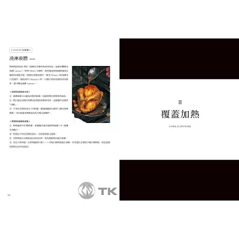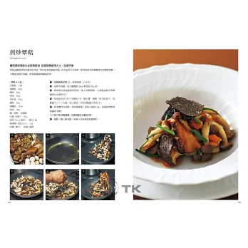 本書中,從法式料理的基礎-CUISSON加熱法,也就是關於「煎烤、煮、蒸、香煎、炸、煙燻…」等,承襲新潮烹調(nouvelle cuisine)偉大主廚們,以及作者長年累積的經驗為「基礎」所完成的主題與內容,共分為18類加熱法: