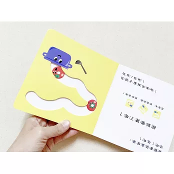 先讓寶寶自己與這本書獨處一番,書中的每個移動式的動態設計,會引發寶寶的好奇心,動動小手,觸摸書中每個凹凸的結構與形狀,透過觸感體驗,挖掘書中的畫面會有哪些奇特的變化。