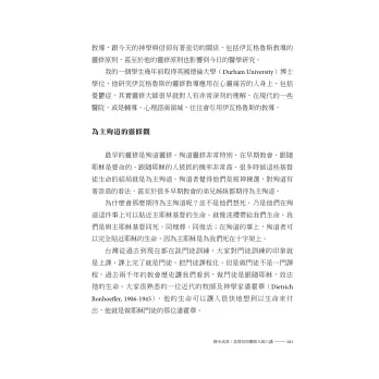 周老師在論述潘霍華的靈修進路時,突出他強調的兩個信念:重價的恩典和團契靈修;此外,潘霍華還提到靈裡合一的關係、屬靈操練和代禱。這一章有幾個不能忽略的重點:不要把福音或恩典教義變得很廉價的偶像化,靈修神學是門徒的靈修神學。還有,要分辨靈裡的團契與魂的團契,這些提醒都引人深思。
