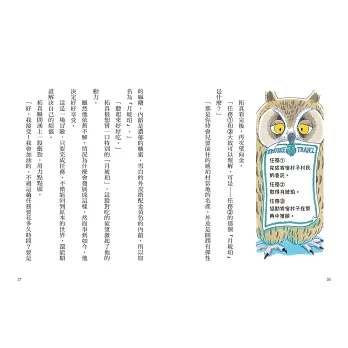 「嘿!你離家出走也沒有意義,做錯事遲早會被發現,重要的是解決問題,疑難雜症旅行社替你規畫一趟最適合的旅遊行程吧!」開口的是一位身材圓滾滾的老爺爺,他戴著圓框眼鏡,穿著焦褐色的工作服搭配金褐色的背心,細細的嘴巴讓人見了,忍不住聯想到……對了!貓頭鷹。