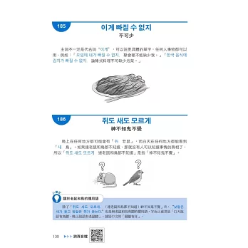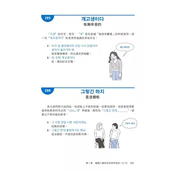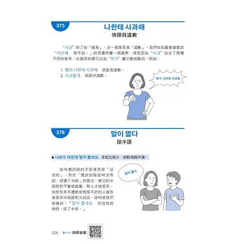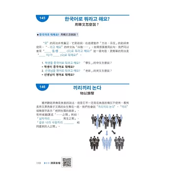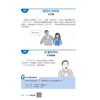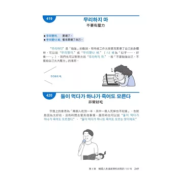 第四,韓國的人際互動講究尊重,對長輩猶重禮儀,這樣的尊重就體現在語言之中。書中附有小筆記,介紹格式體、敬語的使用等等讀者需多留意之處。