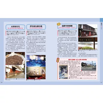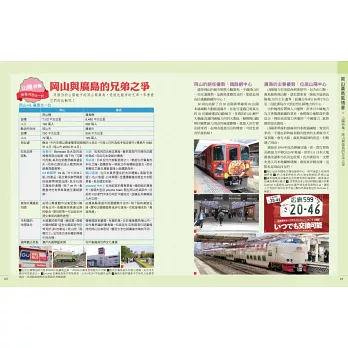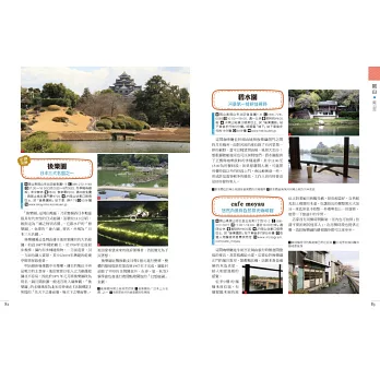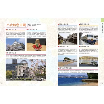 以大篇幅的交通單元詳盡解析岡山與廣島的聯外與聯內交通方式,包含6個機場、兩種JR幹線、10種周遊券推薦、高速巴士、路線巴士、租車自駕、渡輪交通、自行車使用等,無論是購票方式、轉乘提醒,以及作者經驗分享,皆完整說明。此外,書中的15個地區(倉敷、兒島與下津井、津山、高梁、宮島、吳市、尾道、福山等),以及鄰縣地區小豆島、直島、姬路、山陰、岩國、松山等各自的城市交通介紹。