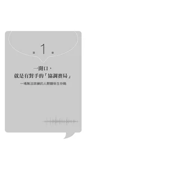 書中不教說服、攻防或話術,而是以心理學與行為科學為根據,為我們展現「說話的本質」,其實是一連串「看不見的選擇」:說與不說、何時開口、選什麼話題、用什麼語氣、回應或沉默……每一秒都在決定關係的走向。