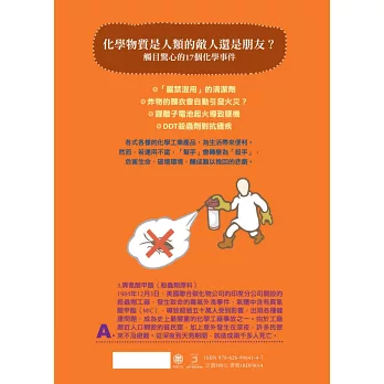 各式各樣的化工產品為生活帶來便利,然而,若運用不當,「幫手」會轉變為「殺手」。本書以化學的「恐怖」故事為主,收錄了許多與化學相關的意外事故,也深刻呈現了企業在缺乏完善安全措施下,對人及生態造成的悲慘後果。