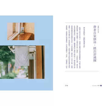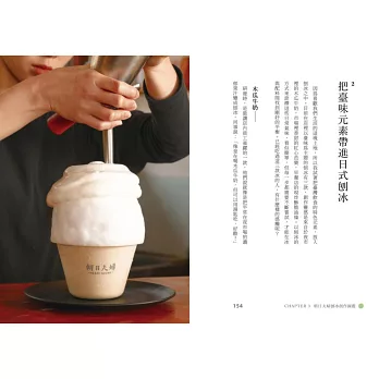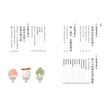 最後,看看日式刨冰的多變魅力,用不同形式體驗品嚐的樂趣,它可以是外帶便當,或是料滿滿的獨享杯,更是讓大人小孩開心交流的活動主題!趕快翻開本書,舀一口刨冰裡的有趣學問吧,每一頁都讓你暑氣全消!
