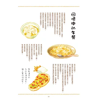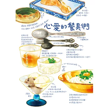書中有料理、有飲品,有出門探索餐廳的經驗,也有自己動手做的食譜,與家人朋友間共享美食的小故事,甚至還有各種圍繞著美食而生的小物與家具。就像珠寶盒般收納著所有與食物相關的物件,不禁令人豔羨,能在心愛的物品與美食圍繞下生活,真是件幸福的事。