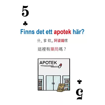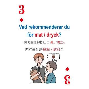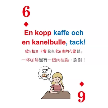撲克牌囊括「日常生活」、「住宿交通」、「點餐購物」、「急難救助」等四大類必學瑞典語萬用句,搭配可愛插圖練習,勇敢開口說,自然而然學會瑞典語!