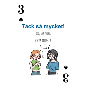 打開撲克牌玩一玩!每張撲克牌都有瑞典語、中文解釋,加上「空耳」文字輔助,讀一讀,跟著音檔,聽一聽,學習瑞典語一點都不難!
