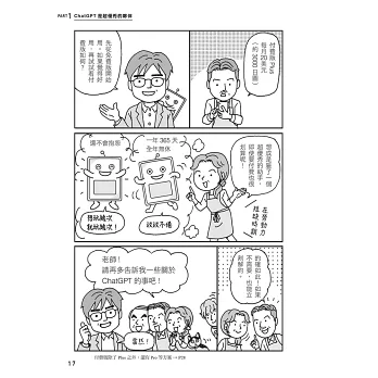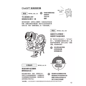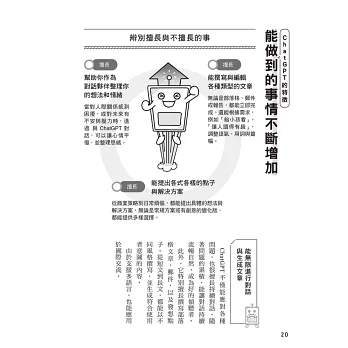 說明 ChatGPT 的基本性質與優勢。它是一種基於 GPT 語言模型的對話型 AI,能夠回答問題、生成文章、進行多語言交流,甚至參與規劃與創作。作者透過漫畫和案例,展示了 ChatGPT 在生活中扮演的角色,如家務助手、商店經營的幫手或日常對話的夥伴。內容也比較了 ChatGPT 與傳統聊天機器人的不同:前者能即時生成新穎的回答,而不只是依靠固定規則。書中同時提醒讀者,雖然它表現自然,但仍只是透過概率計算生成語句,並非真正理解。