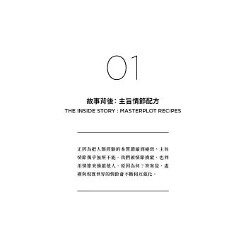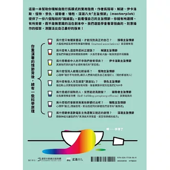 這是一本幫助你理解自我行為模式的實用指南,作者為探尋、解謎、伊卡洛斯、怪物、世仇、弱勢者、犧牲、深淵八大「主旨情節」(masterplot)提供了一份六個階段的「路線圖」。順著路線前進,我們可以深入了解每個主旨情節的構成、在虛構世界與現實生活中如何應用、背後的心理學原理,以及情節是如何被使用或濫用的。