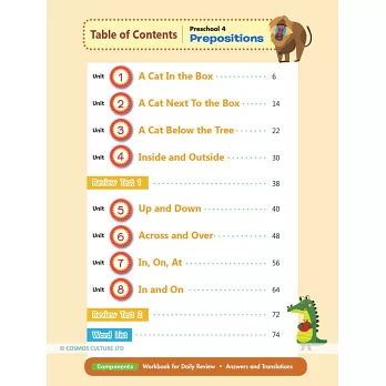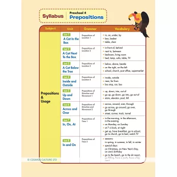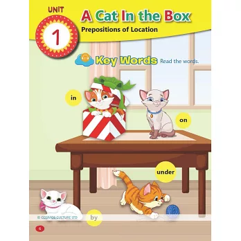 第四冊學習重點為介系詞(Prepositions),主要介紹生活中常用的三大類介系詞:位置介系詞(under, by... )、方位介系詞(up, down...)與時間介系詞(in, on, at),以及認識室內室外空間、佳節與日常活動的情境運用,引導孩童使用正確的介系詞來練習表達相對位置、敘述周遭景物,與動詞進行式及常態活動等不同情境的句子。