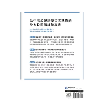 TOPIK閱讀題型繁複,不知從何下手?由兩位教學經驗豐富的老師親自命題、撰寫解析,帶你逐一拆解長篇文章、鎖定關鍵詞,理解韓檢出題邏輯與答題步驟,閱讀長文不再眼花撩亂。