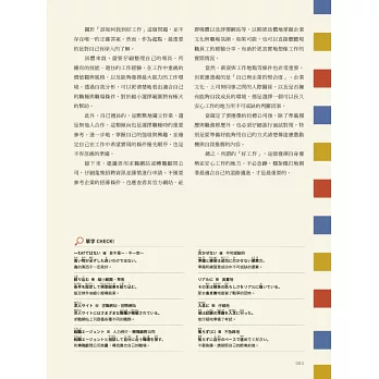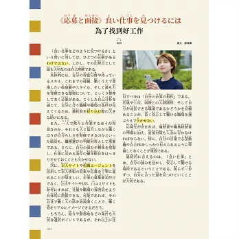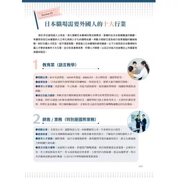 日本也面臨人力短缺的問題。本書特別收錄了十種產業的「相關企業」、「人才樣貌」、「日文能力優勢」。除了事務職,其實還有很多領域、職業可以參考。