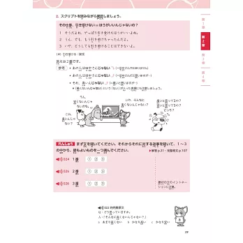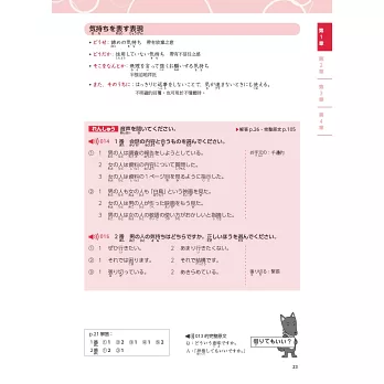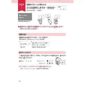 此外,本章會詳加介紹各題型的特色或陷阱,比如「即時應答」的題型,是一對一的簡短對話,要特別小心「語調」,像「~じゃない」「~んじゃない」的語調往上提或往下降表達出的語意就不同;在「理解重點」的題型裡,要特別注意「最も」「それより」「実は…」等詞彙的出現。