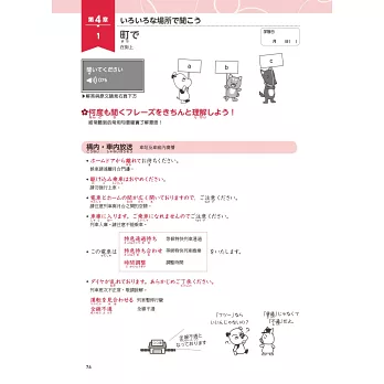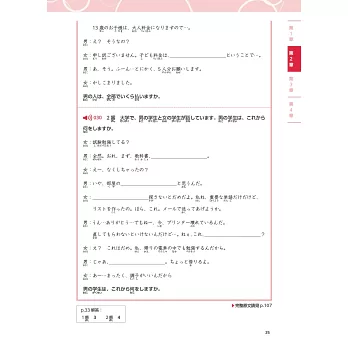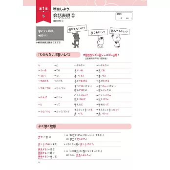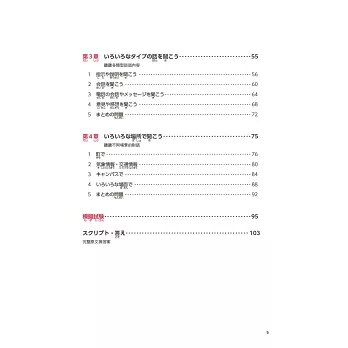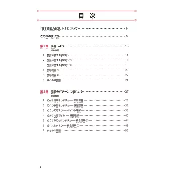 本章共有5個單元,依序以「相似發音的單字」「授受表現」「被動、使役句型」「敬語」及「會話表現與省略」作為訓練目標,透過短句或短會話進行練習,為後面會出現的長篇內容做好準備,扎實奠定基本功。