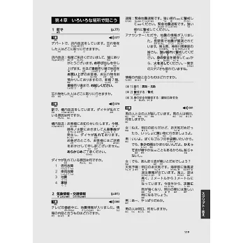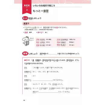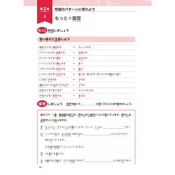 重點3)新增「もっと+復習」篇章。第2~4章的各學習單元結束後皆有一篇「もっと+復習」,共14篇,除加強或補充該單元重點外,亦把該單元測驗過的練習題再以「聽力填充」方式進行複習。