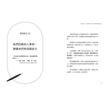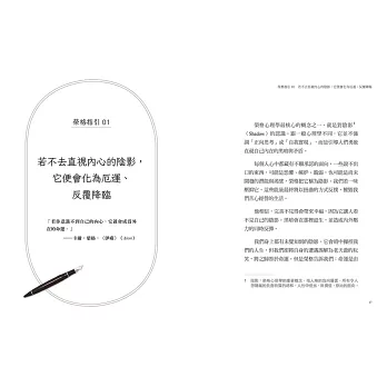 書中的28則金句,都是從榮格著作中摘錄得出,並透過白話的語言解釋、根據主題分為四個不同的篇章。閱讀時,你不需要遵從嚴謹的先後順序,請直接從當下喜歡、感興趣的句子開始,從中找到你需要的力量!