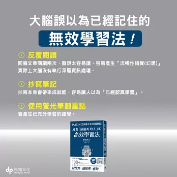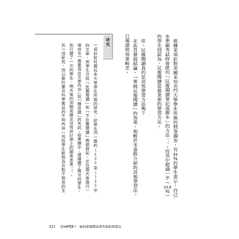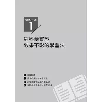 在第1章中,會先介紹那些從科學的角度看來效果不彰的學習方法。我認為,想提高學習效率的話,首先應該知道哪些是效果較差的方法,從而減少花在這些方法上的時間,將節省下來的時間運用在效果更高的學習方法上。