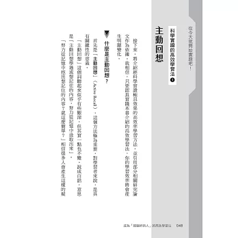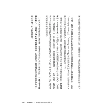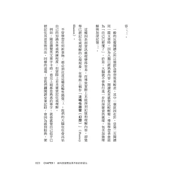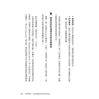 第2章則會詳述那些經科學驗證效率較高的學習方法,並引用一部分代表性的研究論文作為理論基礎,同時具體介紹我在學習時是如何實際運用這些方法。