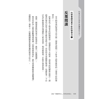 另外,本書並非專為準備特定升學考試或證照考試的人所寫,而是以所有學習者為目標讀者。本書中所介紹的學習方法,效果涵蓋語言學習、職涯發展、興趣探索,或是透過閱讀及上網收集資訊等各種學習類型。只要是涉及吸收新知識的行為,本書都能成為極有用的參考。