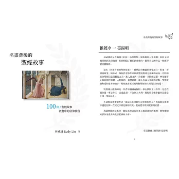 這本《名畫背後的聖經故事》,雖然沒有艱澀的神學語言,但用「看圖說故事」的方式,展現作者多年來研讀聖經與西方藝術的結晶。巧妙的結合聖經信息與藝術之美,進入達文西、拉斐爾、米開朗基羅、林布蘭等 大師的創作筆觸。人物鮮活,氣勢磅礡,讓人有身入其境的感動。聖靈啟發和延伸思考的設計,幫助讀者更深刻理解聖經的真理與上帝的愛。