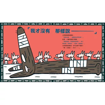 「我要吃掉你們!」大野狼吶喊著,但他的嘴巴纏了一圈又一圈的繃帶,小豬們只聽到「嗚嗚嗚……嗚嗚嗚……」的聲音。