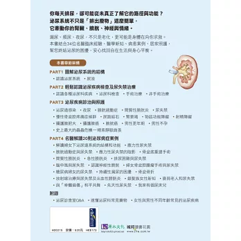 ☑全面解析泌尿疾病與治療方式:涵蓋尿失禁、膀胱過動症、攝護腺肥大、泌尿道感染等常見病症,並詳述手術與非手術療法。