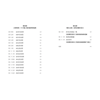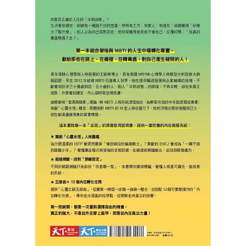 謝謝這本書,很生動地、很有系統地結合了榮格心理學及MBTI人格分析,讓我對照出自己蛻變的歷程。未定型的半熟時期,或許會陷入混亂,但正是深度開發自己的最佳時刻。菊仙大力推薦給想要超越自我限制、拆去固化人格面具的讀者朋友。」――《五十歲後我出去一下》作者 彭菊仙