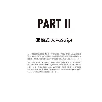 你將從學習變數、陣列、物件、函式、條件判斷、迴圈、類別等基本的程式設計概念開始;在生動的範例和實作練習的幫助下,這些基礎知識將幫助你結合JavaScript、HTML與CSS,建立可以立即執行的互動式網頁應用程式。
