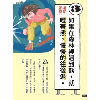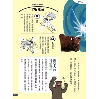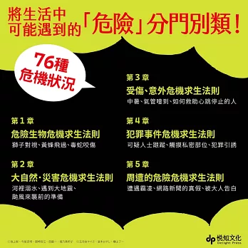 收集了76種危機狀況,有凶猛生物、自然災害、意外事故、犯罪事件、周遭危險等,除了提供正確的應變方法,還會列舉常見的錯誤舉動。