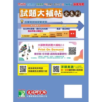 (1)每一本書皆收錄歷屆考題及詳解,讓考生不需費力上網爬文找歷屆試題,只要一本試題大補帖在手,便能立即實戰演練,並有效整理歷屆考試重點,作為考前衝刺複習書。