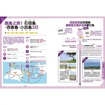 - 一次K.O複雜交通、票券:從單軌電車到長途巴士、公車,渡輪、快艇等,以及各方PASS、觀光巴士、自駕遊等,龐大資料通通圖表式整理,搭配超詳盡解說和分析,協助你以划算、省時、高CP值的方式暢遊沖繩。