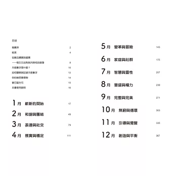 數字是人類文明發展中的獨特符號,無論其由來為何,在每段古老文明的演進中皆承載了許多意義和故事,是宇宙跟人類之間的連結,也是宇宙運行、生命本質甚至神祕力量的密碼。這本《366天靈魂曆》中,收集了數字的根本核心意義,附有非常詳細的說明並教導如何運用之餘,每天都有一個對應的水晶誕生石及可撰寫的小筆記欄,是非常實用的天使數字應用與解答書。讀者可每天翻閱、對照、體會、記錄,將生活中的微小觀察一一撰寫下來,並藉由融會貫通,掌握天使及宇宙所要傳達給你/妳的訊息和叮嚀,將「吸引力法則」活用於日常之中。──企業管理、心靈成長講師/林佳蓁