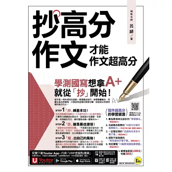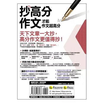 看到題目先別急著天馬行空發揮,先學會怎麼寫得像高分作文!「創意來自完美的抄襲」,但不是要你逐字逐句抄,而是參考學測國寫滿級分學生的高分範文,抄句型、抄技巧、抄論述架構。只要照著練久而久之就能從基礎到精深,不僅能熟練清楚論述、層次分明、真摯動人的高分寫作技巧,更能充分掌握高分作文的論述架構。