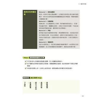 每個造型類別皆統整不同作法的特色、適用情境、施作重點與監工要點,透過簡明表格呈現,讓讀者能快速比較造型差異,選擇最合適的做法。