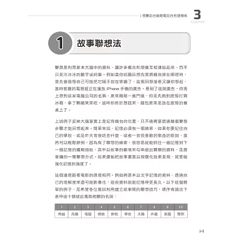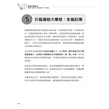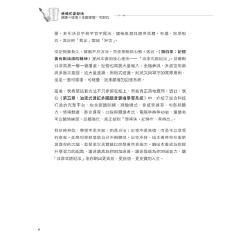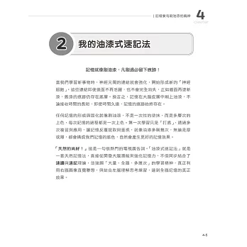 第三章收錄故事聯想、事件串連、房間定位、心智圖等速憶術,把難記資訊變得具體又有趣。第四章提出本書核心「油漆式速記法」,透過大量輸入、多感官刺激與多層次複習層層覆蓋,記憶更扎實,特別適用於語言與單字學習。