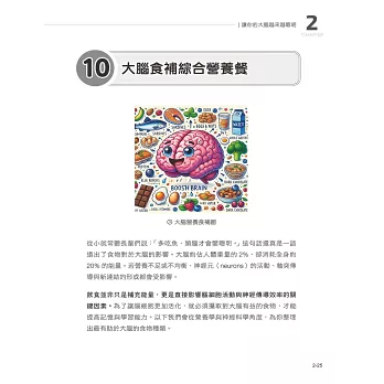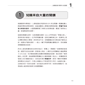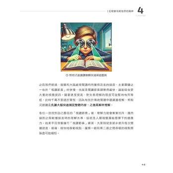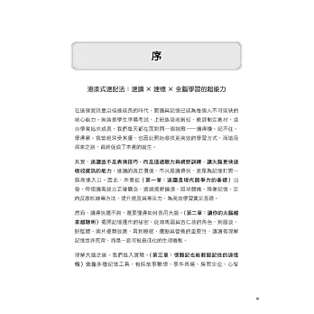 第一章說明視野訓練、眼球體操與定向反應,建立速讀基礎,讓閱讀速度自然提升。第二章深入大腦機制,揭開海馬迴、腦波、圖片優勢、睡眠與運動對記憶的影響,讓你懂得如何「用對大腦」。