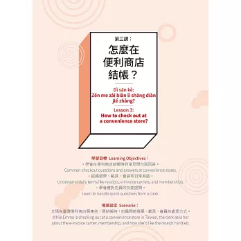 10 lessons with Hanyu Pinyin to help you with pronunciation. This book includes diverse and practical scenarios — introducing yourself, ordering drinks and food, asking for directions, taking the MRT, and learning Zhuyin. Follow along with the audio and start speaking right away!