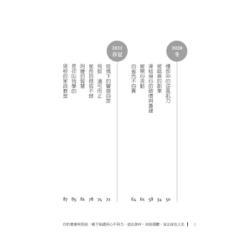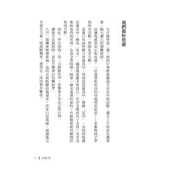 這大概是我第二次看見媽媽是怎麼想的。我在職場曾遇見一位前輩,對唯一的兒子可以說「無微不至地照顧」。用「照顧」當然站在她的角度,說「控制」更像是我們看到的。小到每日行蹤,大到考試分發,前輩似乎有個腳本,強硬地將她的小孩塞進去角色扮演。而姜慧珍在《你的青春照見我》裡,卻用二○二○年秋天到二○二三年夏天這三年,跟著孩子走進花蓮中學,超真實地告訴我們,媽媽的控制來自於什麼樣的焦慮。如同作者自己形容的「二次青春期」,她把自我的煩惱與期待,與孩子的生命糾纏在一起。然而隨著閱讀緩緩推進,我反而覺得,正是這種青春期的能動性,包含孩子的伸展與母親的自我覺察,都讓他們在這三年的時間,攜手將這一切緩緩鬆綁。