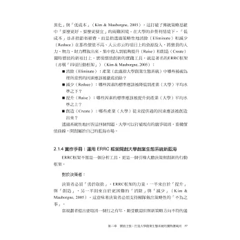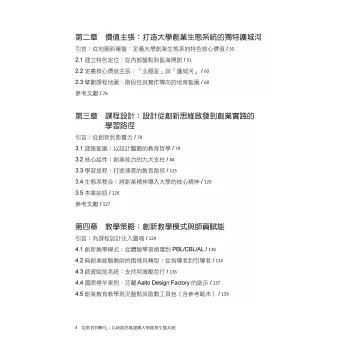 全書以新創思維為基底,從十個面向出發-策略定位、價值主張、課程設計、教學策略、創業輔導、資源整合、品牌驅動、財務永續、影響力衡量、永續領航,並在每個章節都用不同角色的角度陳述彼此的任務分工。
