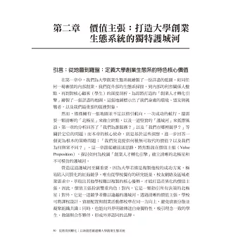 因此,這本書的核心價值:打造「創業人才轉化引擎」。希望能打破過往斷點式打造創業教學學程或行政相關制度的概念,而將整個系統建置視為一個內部「創業」專案,並且用新創規劃經營思維做規劃執行,從顧客(校園師生)角度出發,從啟蒙到驗證,從輔導到加速,進而打造出來一個真實符合需求且能永續營運的創業生態系統。