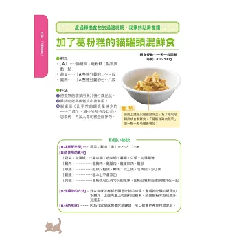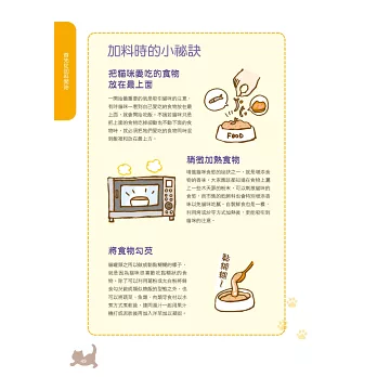 ‧自製鮮食與食材的選擇與保存技巧:從食材挑選、基本切法到烹調方式與保存技巧,讓你的貓咪一步一步愛上鮮食。