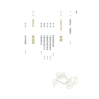 本書從彩繪大師莊武男的出身、學藝及傳承一路娓娓道來,並觸及台灣傳統彩繪的發展、南北匠師的分布,也细述了大師從文物修復到收藏、保護的歷程與故事。