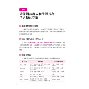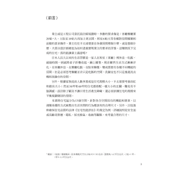 本書將住宅區分為13個空間(玄關、樓梯、廁所、洗臉室、浴室、和室、廚房、餐廳、客廳、主臥室、小孩房、衣帽間、陽台),針對各自空間的機能、配置和重要功能,淺顯易懂地統整出其間的生活行為所應該有的合理尺寸。並特別將高齡者的安全及無障礙設施納入設計考量。是一本針對專業住宅設計者、考慮購買或興建自用住宅人士,對應少子化、高齡化社會相當實用的設計實務參考工具書。