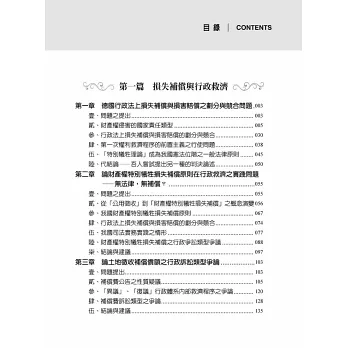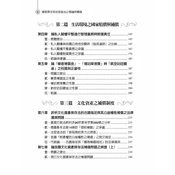 第一篇至第四篇所收錄的十一章論文(特別犧牲補償),涵蓋從土地徵收、文化資產保存、交通噪音與空間使用限制等生活層面的具體案例,到德國法與我國制度之比較分析,並進一步回應實務中補償法理運用的困境與法制缺漏。藉此研究,筆者意圖呈現補償概念從社會義務的「消極忍受」轉向特別犧牲的「積極立法」(法定補償)的制度演變,並試圖在現行法秩序與憲法保障之間勾勒出補償義務的輪廓。